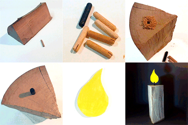 Nun einfach den Dübel mit dem Schlitz nach oben in das Loch stecken und festklopfen. Dabei sollte man auf die Richtung des Schlitzes achten, denn die legt fest, in welche Richtung später die Flamme zeigt. Schließlich noch die Flamme in den Schlitz stecken und ggf. mit etwas Leim fixieren. Fertig ist die Kerze.